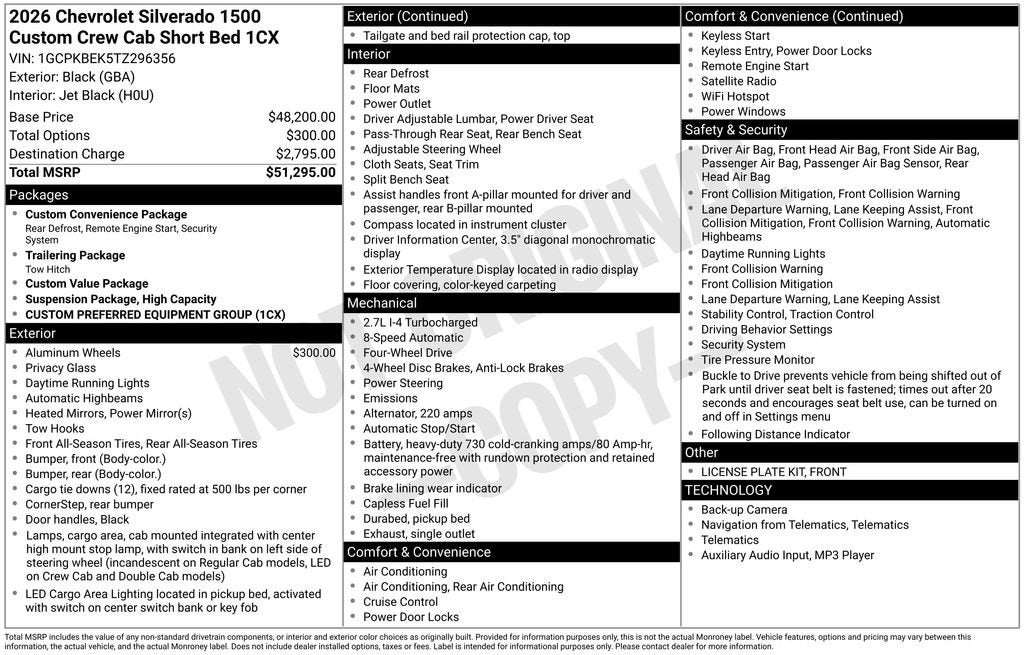 Black 2026 Chevrolet Silverado 1500 Custom 4WD 8-Speed Automatic 2.7L I4 Turbocharged DOHC 16V LEV3-SULEV30 310hp