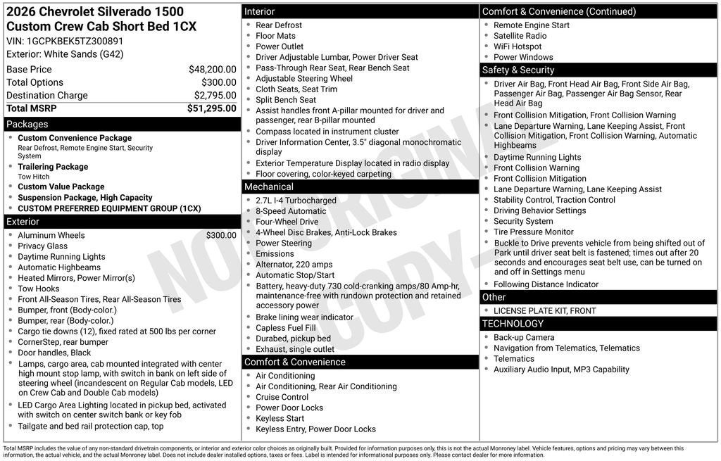 White Sands 2026 Chevrolet Silverado 1500 Custom 4WD 8-Speed Automatic 2.7L I4 Turbocharged DOHC 16V LEV3-SULEV30 310hp