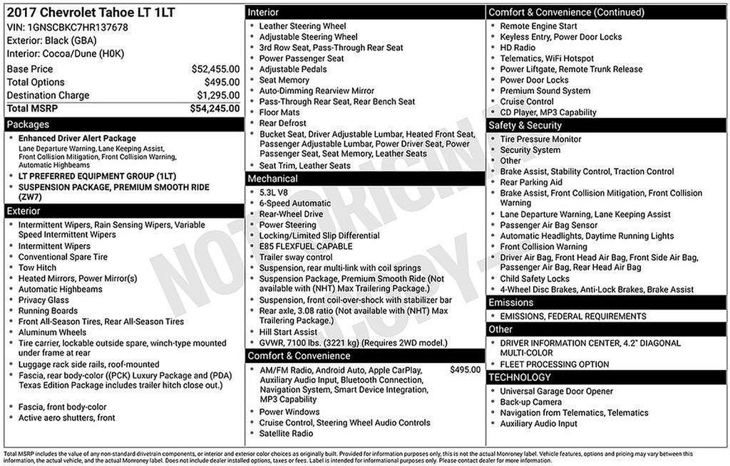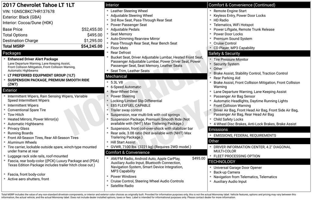 CALL NOW!! This vehicle will not make it to the weekend!! Recent Arrival! Clean CARFAX.Cocoa/Dune Leather.Black 2017 Chevrolet Tahoe LT RWD 6-Speed Automatic Electronic with Overdrive EcoTec3 5.3L V8Luck Chevrolet Processing Fee* Internet prices do not include $999.00 Processing Fee, DMV Fees or any applicable taxes. New vehicle internet prices also do not include any add on equipment and/or BUYER SELECTED suspension lift, body lift, any truck body (for commercial vehicles), custom wheels, custom tires, custom paint or other similar aftermarket products (either depicted or not depicted on website) on these specialty items, which can be added to a vehicle. While every attempt has been made to ensure the accuracy of the data displayed, the dealership is NOT RESPONSIBLE for any errors or omissions. Luck relies on third party companies to display the pricing and technical specifications. Technology glitches can cause the incorrect information to display and the dealership is not responsible for the resulting errors. Must present internet ad prior to sales for ad price. These prices are not to be combined with any other Luck offers. See a manager for more details. The results of this calculator should only be used as an estimate. Actual financing plans require more complex calculations than the simple compounded interest used in this program.Awards:* JD Power Automotive Performance, Execution and Layout (APEAL) Study, Dependability Study * 2017 KBB.com Best Buy Awards * 2017 KBB.com 12 Best Family Cars * 2017 KBB.com 5-Year Cost to Own Awards * 2017 KBB.com 10 Most Awarded BrandsReviews:* Seating for up to nine passengers; standard V8 engine assures plenty of passing power and a substantial tow rating; nicely trimmed cabin is one of the best in the class; available two-speed transfer case gives the Tahoe better than average off-road capabilities. Source: Edmunds