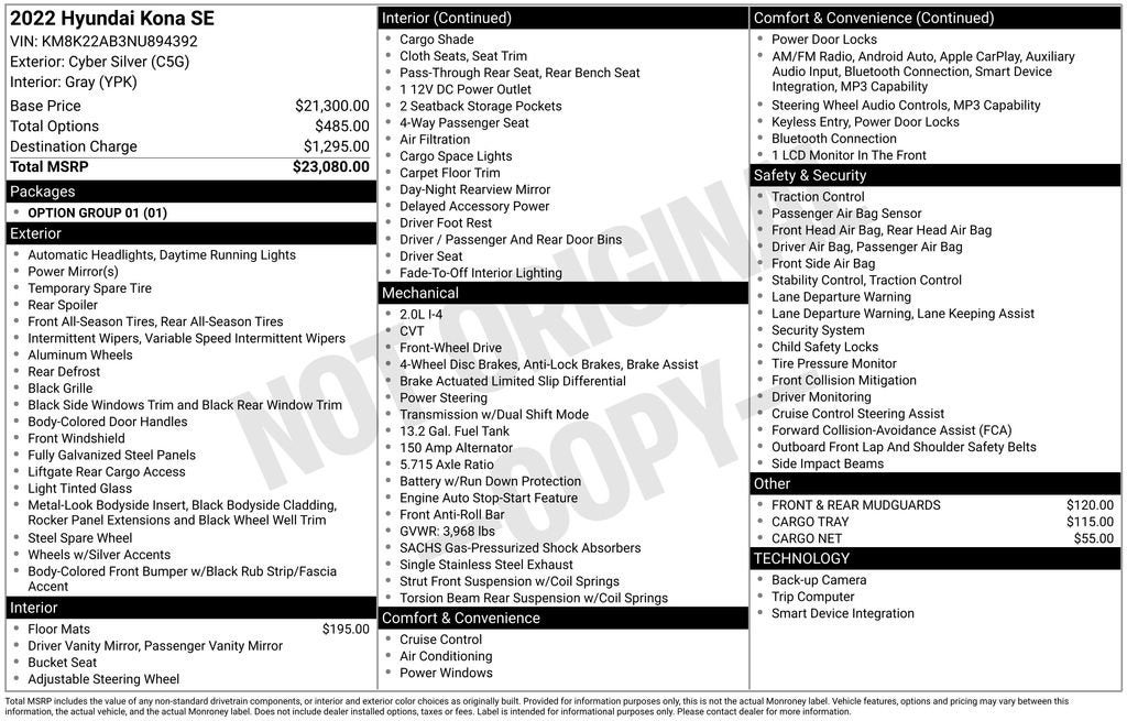 CALL NOW!! This vehicle will not make it to the weekend!! Recent Arrival! Odometer is 15276 miles below market average!Cyber Silver 2022 Hyundai Kona SE FWD CVT 2.0L I4 MPI DOHC 16V LEV3-ULEV70 147hp30/35 City/Highway MPGLuck Chevrolet Processing Fee* Internet prices do not include $999.00 Processing Fee, DMV Fees or any applicable taxes. New vehicle internet prices also do not include any add on equipment and/or BUYER SELECTED suspension lift, body lift, any truck body (for commercial vehicles), custom wheels, custom tires, custom paint or other similar aftermarket products (either depicted or not depicted on website) on these specialty items, which can be added to a vehicle. While every attempt has been made to ensure the accuracy of the data displayed, the dealership is NOT RESPONSIBLE for any errors or omissions. Luck relies on third party companies to display the pricing and technical specifications. Technology glitches can cause the incorrect information to display and the dealership is not responsible for the resulting errors. Must present internet ad prior to sales for ad price. These prices are not to be combined with any other Luck offers. See a manager for more details. The results of this calculator should only be used as an estimate. Actual financing plans require more complex calculations than the simple compounded interest used in this program.