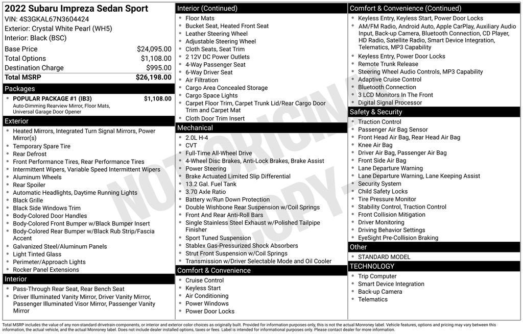 Crystal White Pearl 2022 Subaru Impreza Sport AWD CVT Lineartronic 2.0L DOHC