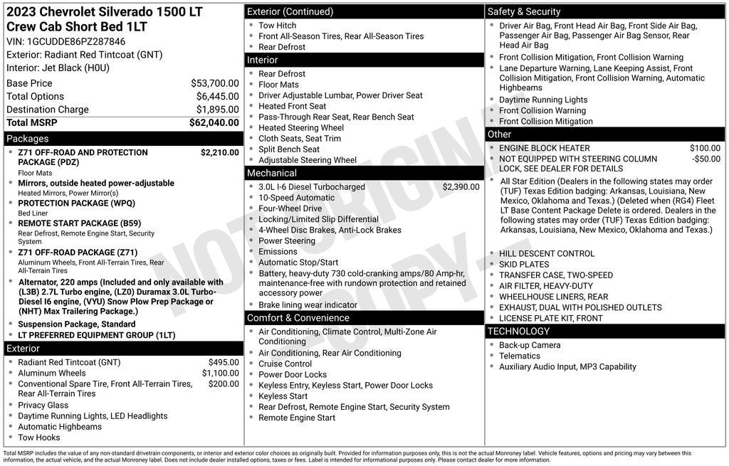 Radiant Red Tintcoat 2023 Chevrolet Silverado 1500 LT LT1 4WD 10-Speed Automatic 3.0L I6